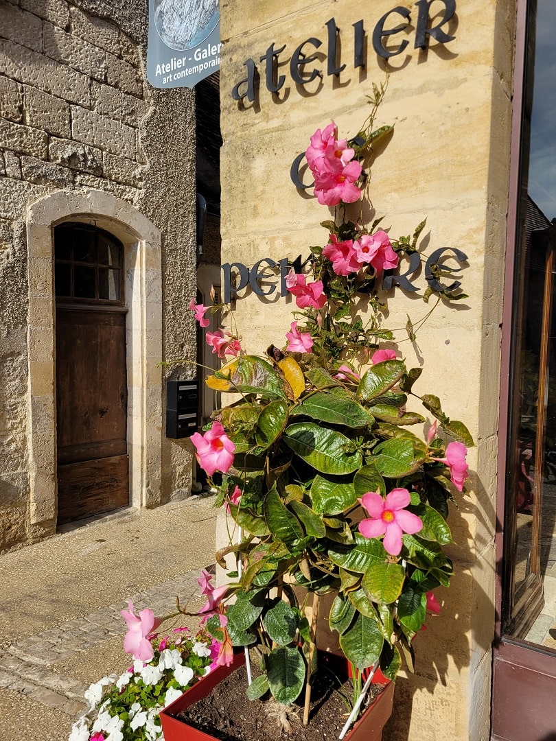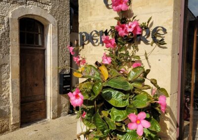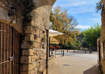 Wir schlendern durch die schmucken Gassen steil hügelaufwärts. Ockerfarbene Häuser aus dem Mittelalter säumen unseren Weg. Vor unserem inneren Auge reisen wir zurück in die Vergangenheit und befinden uns im geschäftigen Limeuil des 18. Und 19. Jahrhunderts. Damals erlangte das Städtchen Reichtum durch die Binnenschiffahrt. Rund 80 Handwerker hatten hier ihre Werkstätten und mit 900 Seelen zählte der Ort drei Mal so viele Einwohner*innen wie heute.Garten vor dem Rathaus von Limeuil