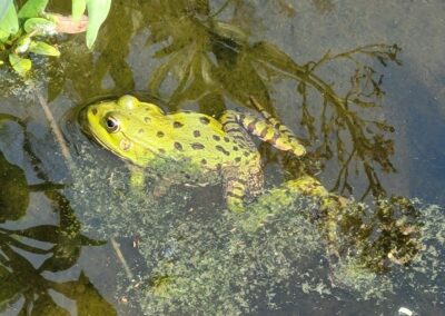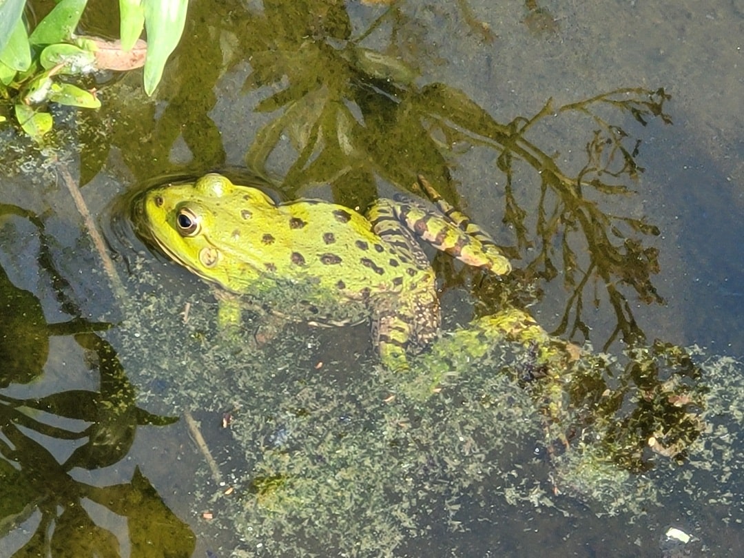 Nach dem langen, heißen Sommer (fast) ohne Niederschlag haben die Kastanienbäume hier ihre Blätter fallen gelassen. Der Panoramablick im vorderen Teil des Gartens ist schön, die Farben jedoch von der lang anhaltenden Trockenheit ausgeblichen. Bei der Quelle oberhalb des Felsens empfängt uns üppiges Grün und paddelt munter ein Frosch.